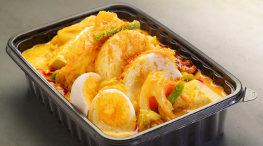 A delectable dish of mixed vegetable curry with a lovely coconut cream aroma served with rice cake, egg and tau kwa.