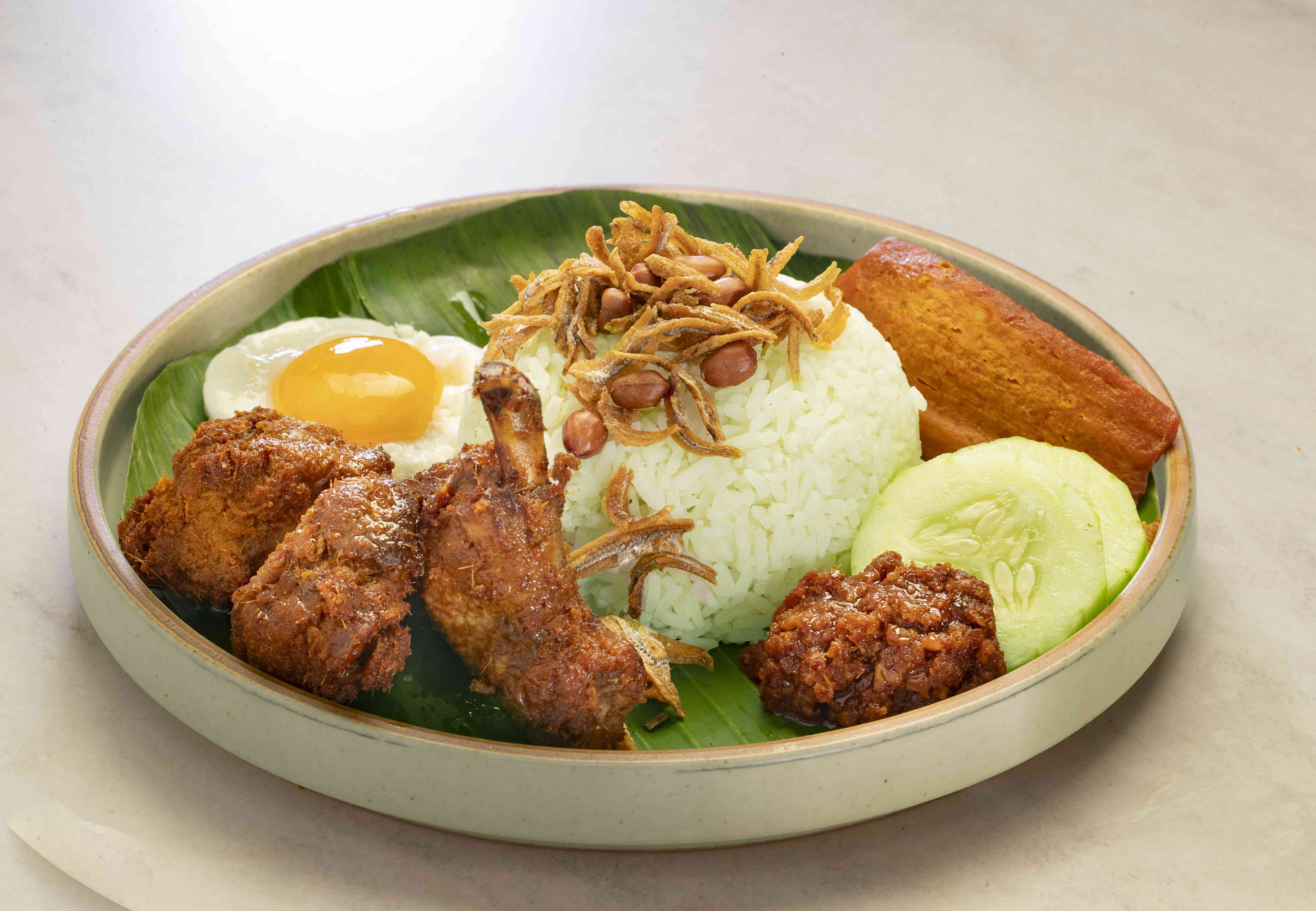 Fragrant pandan coconut rice, served with signature sambal chilli, crispy ikan bilis & peanuts, sunny egg, otah and spiced marinated chicken.
